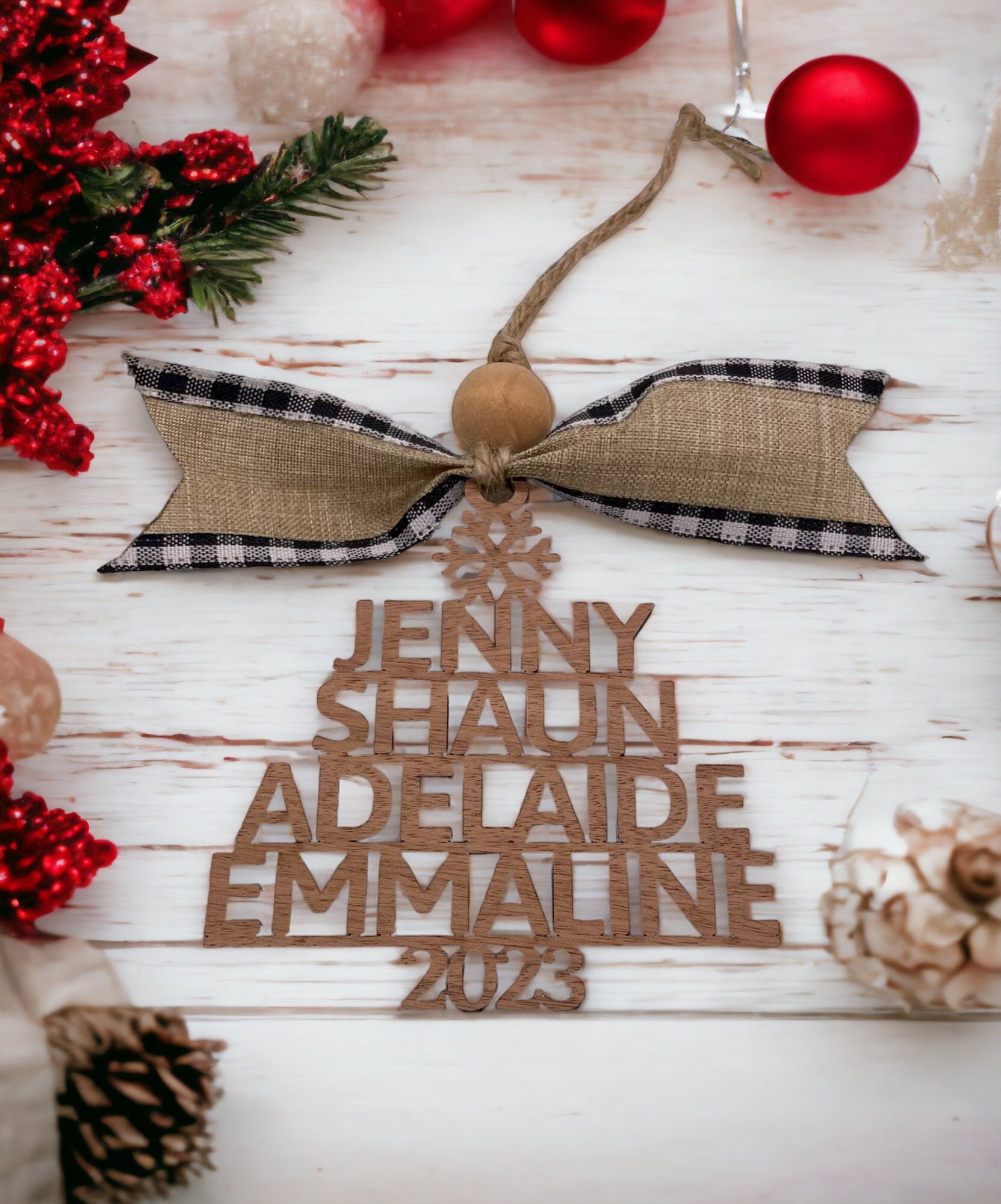 Celebrate this holiday season with a truly unique and personalized touch for your tree. Our handcrafted ornament is made from beautiful wood and shaped like a Christmas tree, complete with a snowflake topper and a trunk made up of the year "2024," making it the perfect addition to your festive decor. The ornament includes a neutral ribbon (may differ slightly from picture) and a wooden bead with a twine hanger, adding a rustic and charming touch.