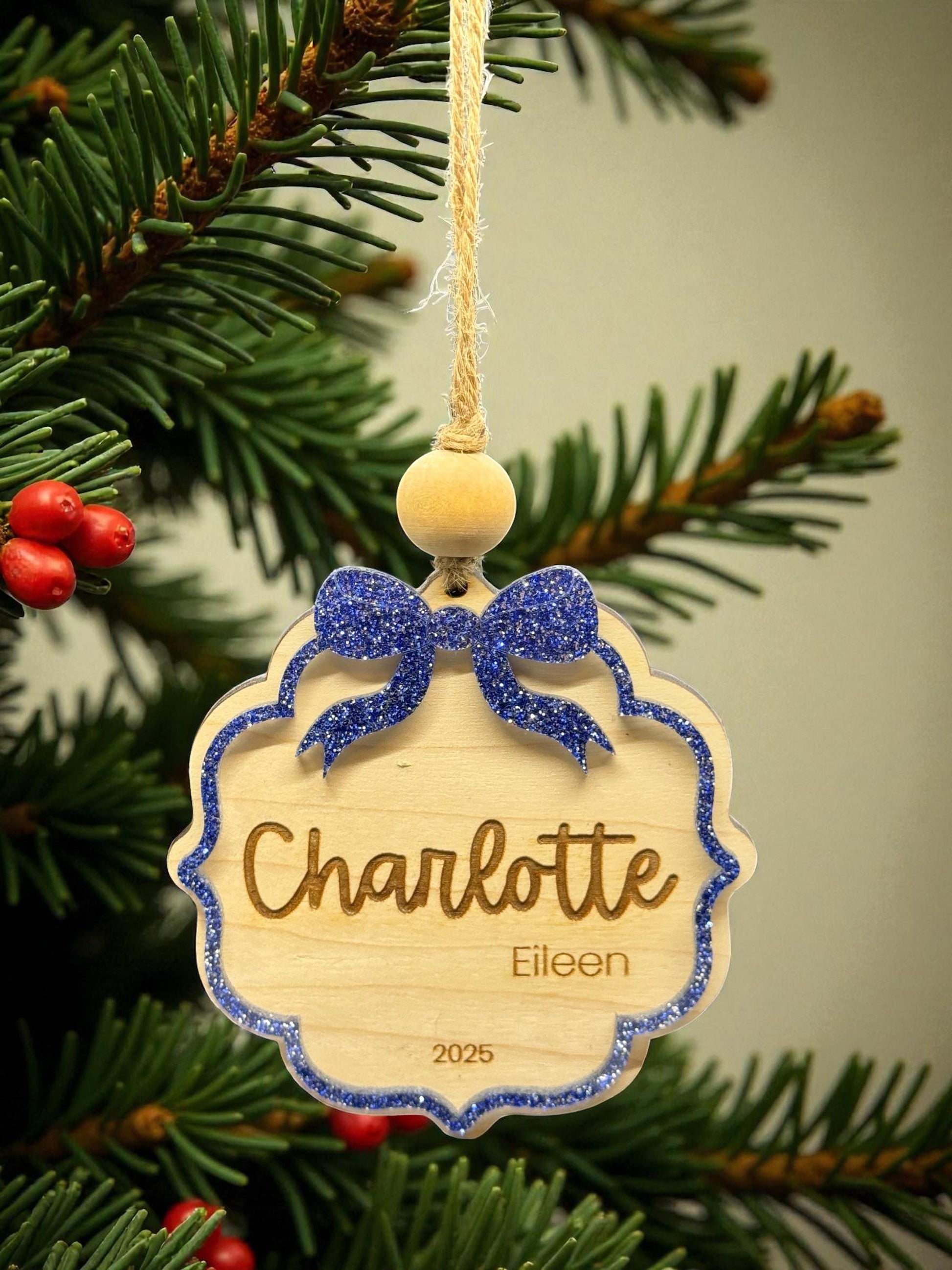 Personalized Maple & Acrylic Bow Ornament – First + Middle Name, Year Included