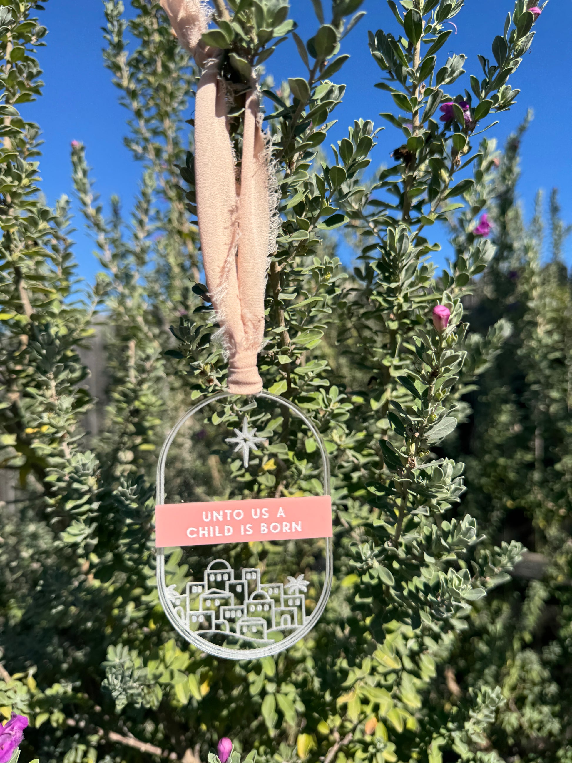 Faith-inspired layered acrylic ornament with Jerusalem skyline and North Star design. “Unto Us a Child Is Born” engraved on dusty pink acrylic.
